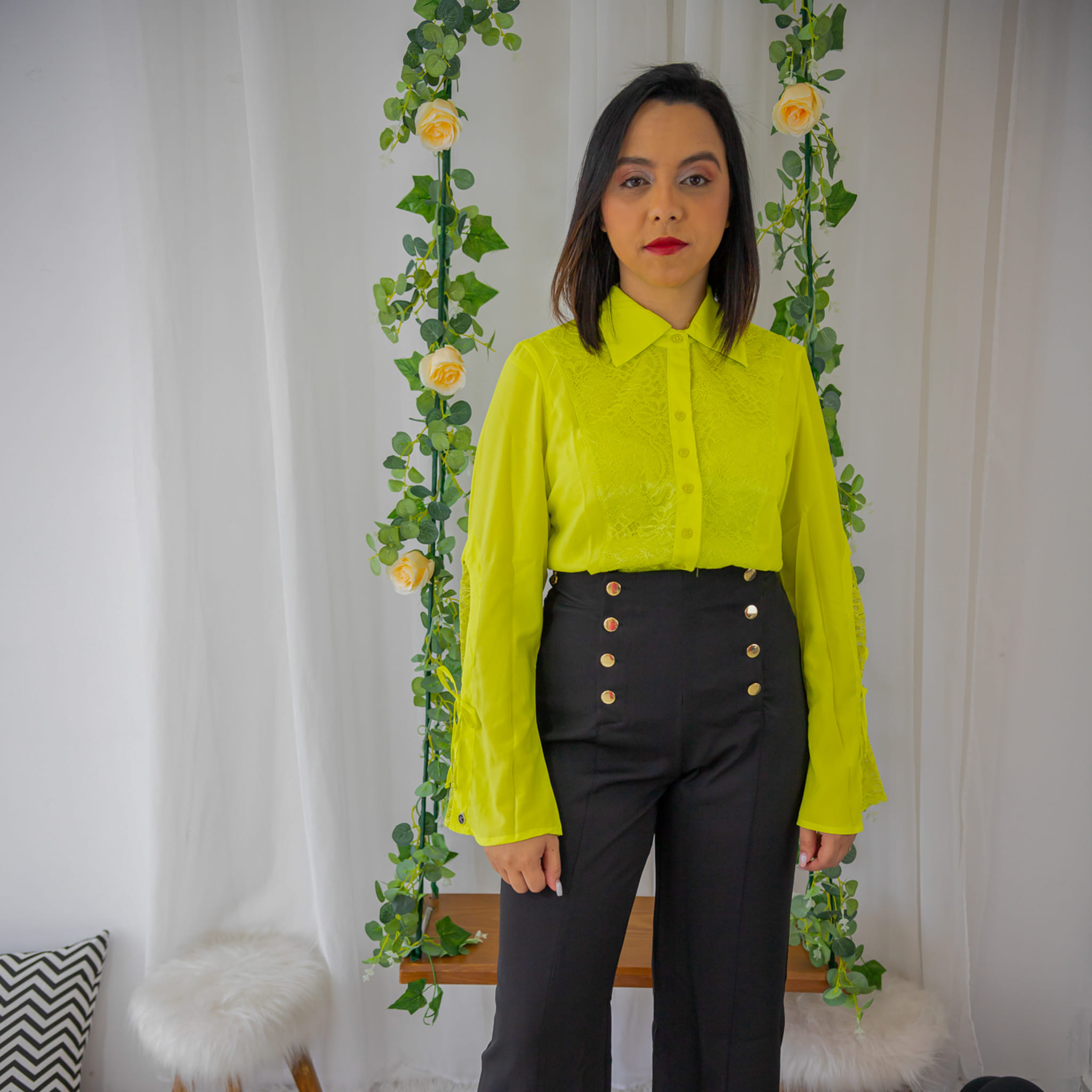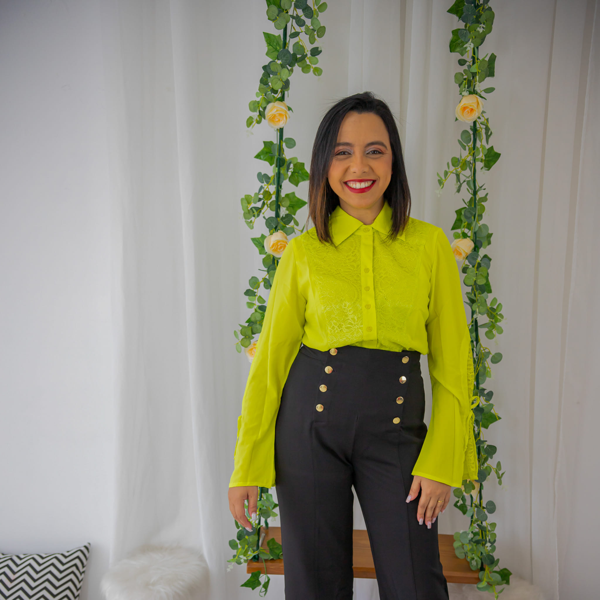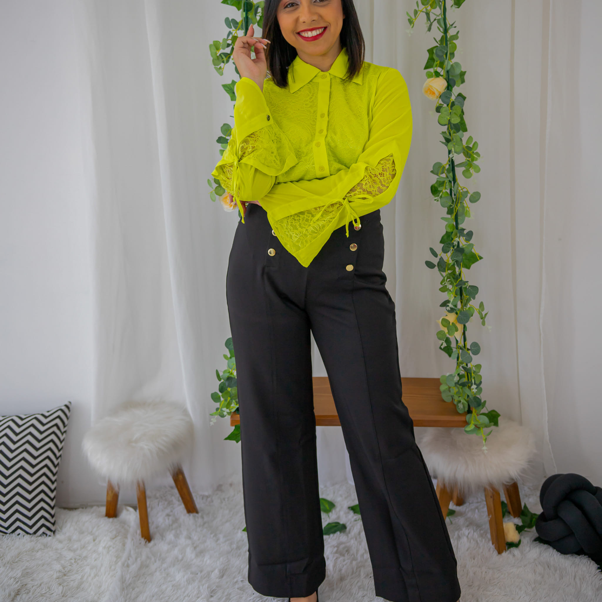 A Calça Catarina é a combinação perfeita entre estrutura e estilo. Com corte reto, cintura alta e botões dourados decorativos, ela traz um ar sofisticado e moderno. O tecido encorpado garante caimento impecável, enquanto o design atemporal permite composições que vão do profissional ao elegante com facilidade.