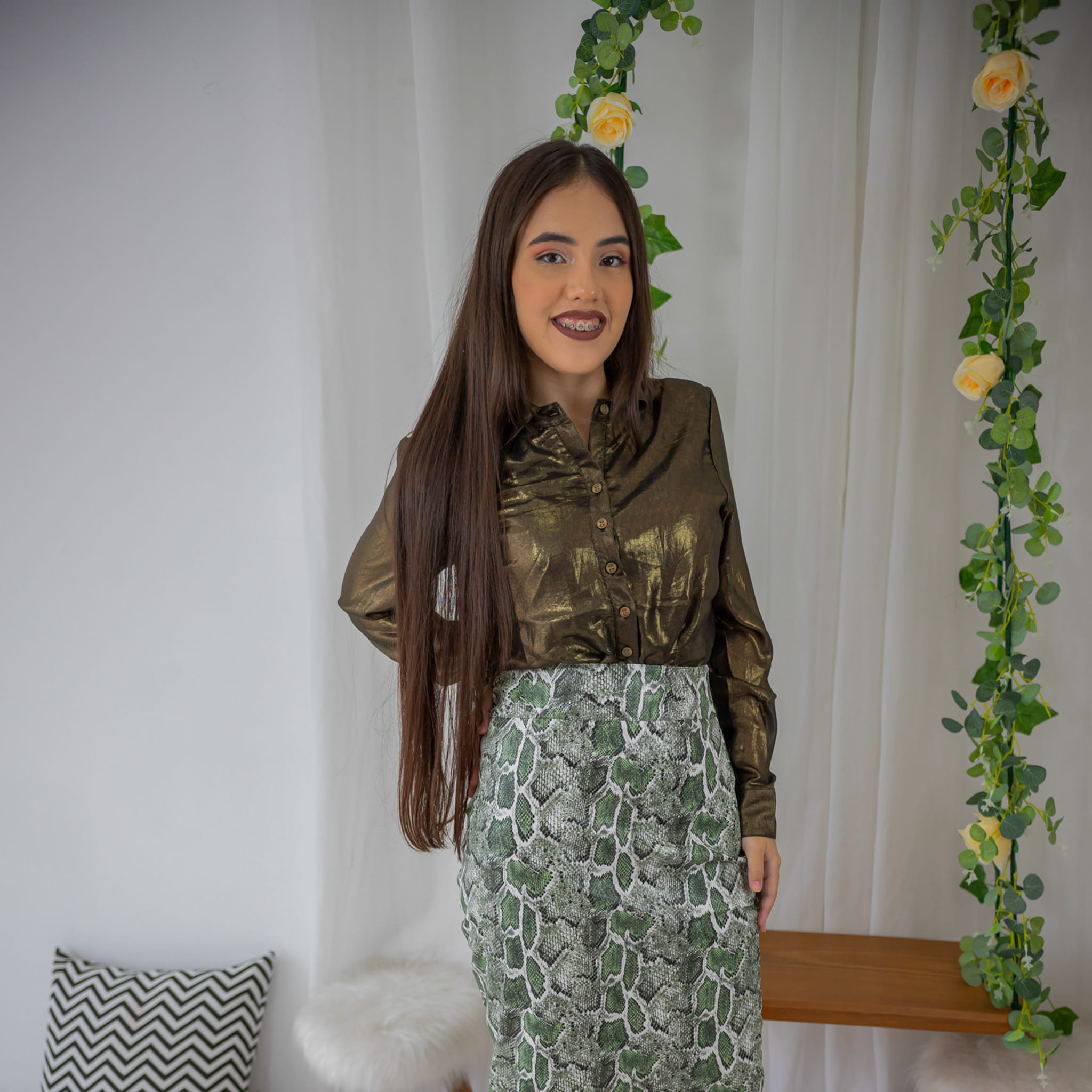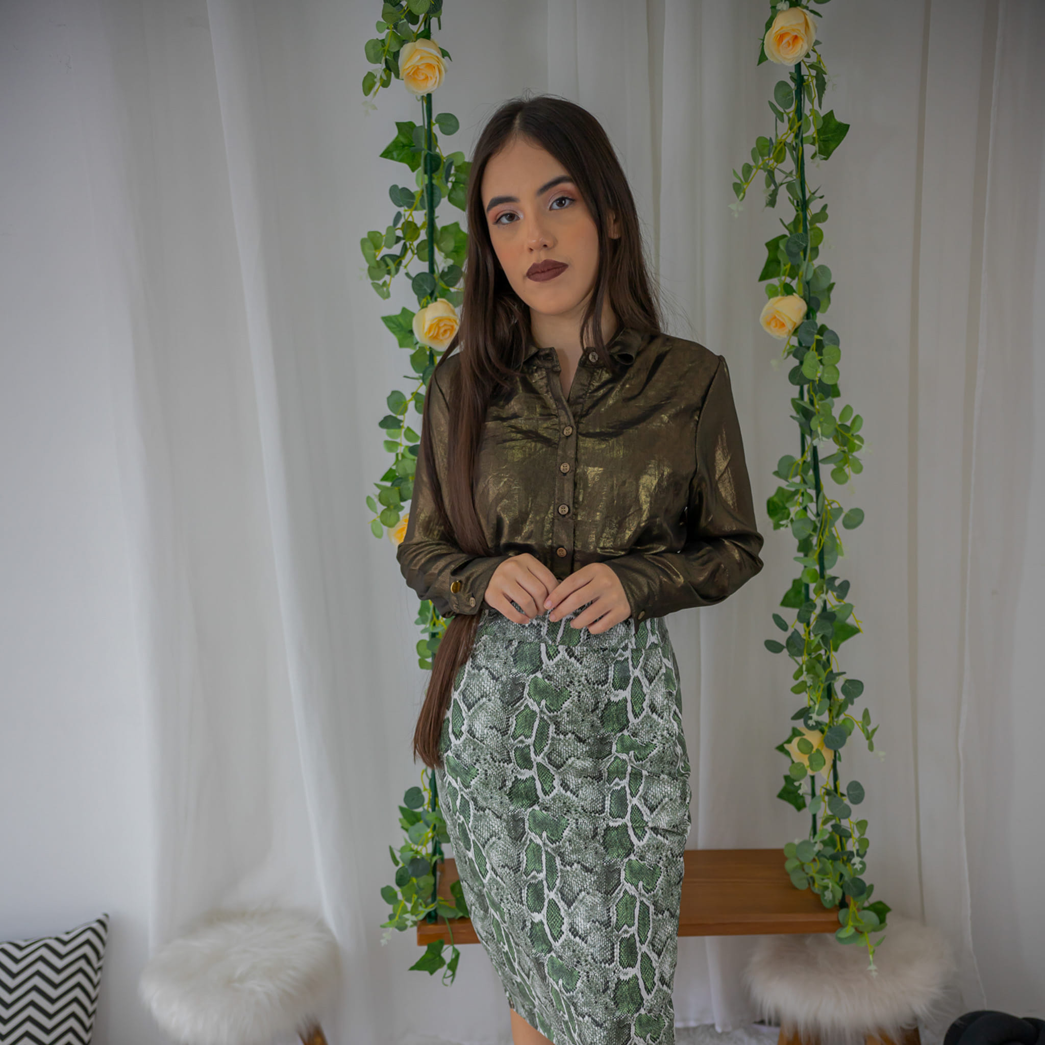 Com um visual moderno e ousado, a Saia Python Green aposta na estampa de cobra em tons de verde como protagonista. O corte ajustado ao corpo realça a feminilidade sem abrir mão da sofisticação. Ideal para produções fashionistas com blusas neutras ou camisas com brilho, como na composição da foto.
